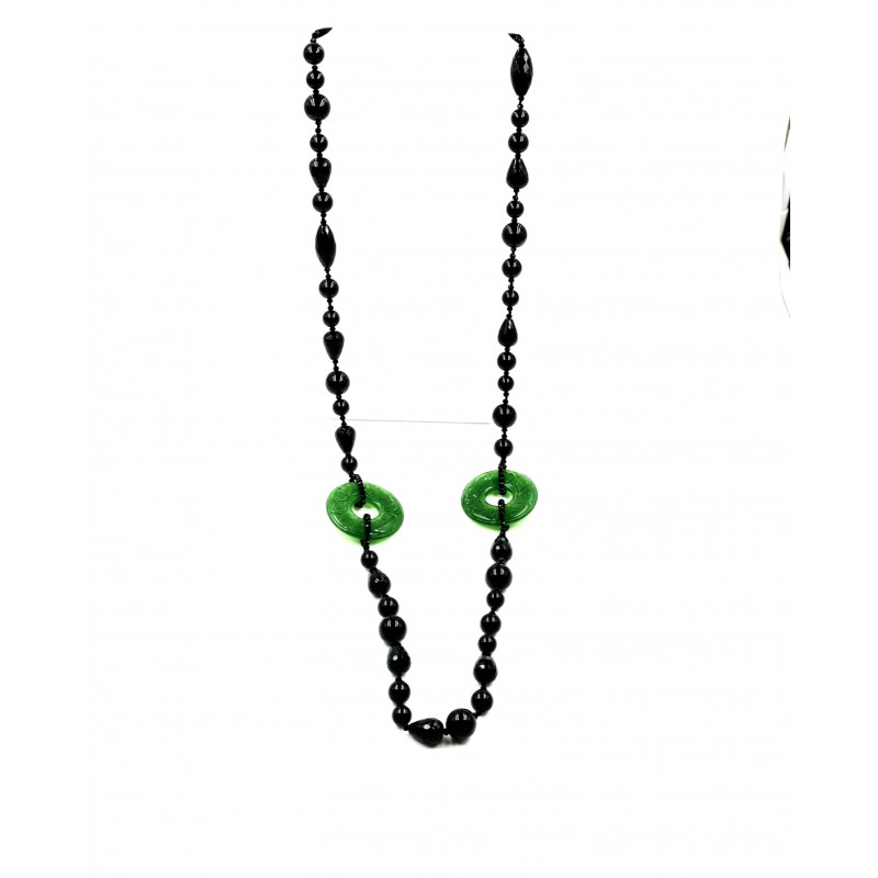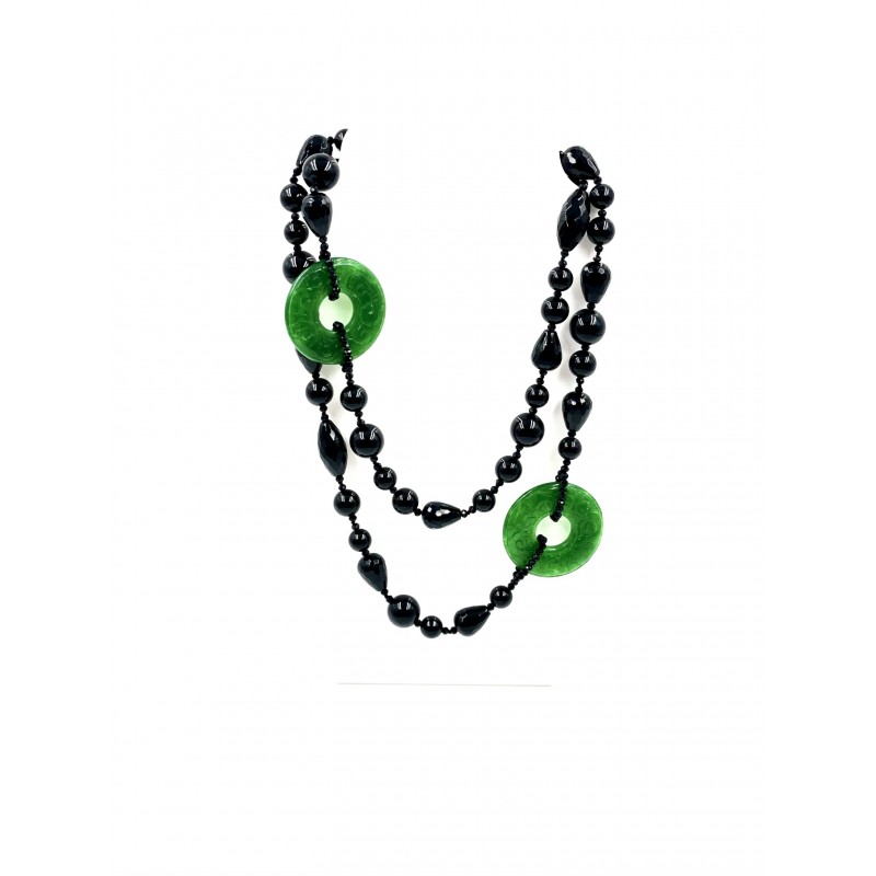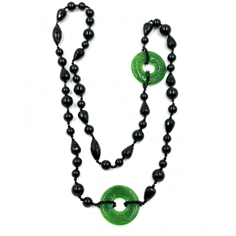 Composé de superbes pierres de Agate noire en 6 taille différentes et 2 Donuts de jade vous fait voyager par la splendeur des perles noires.