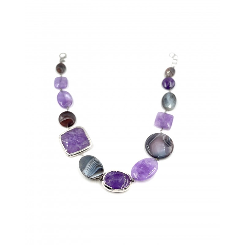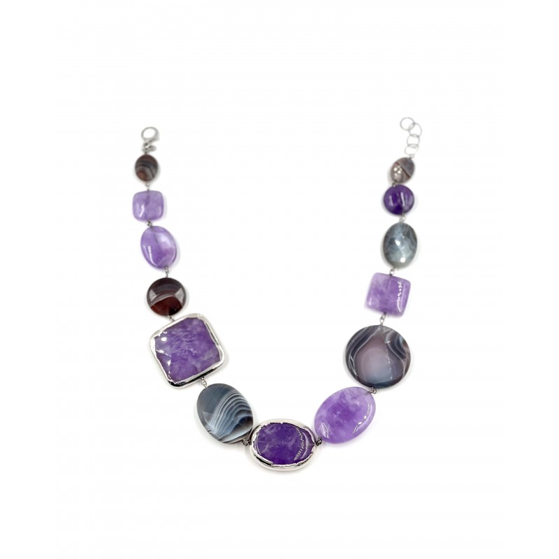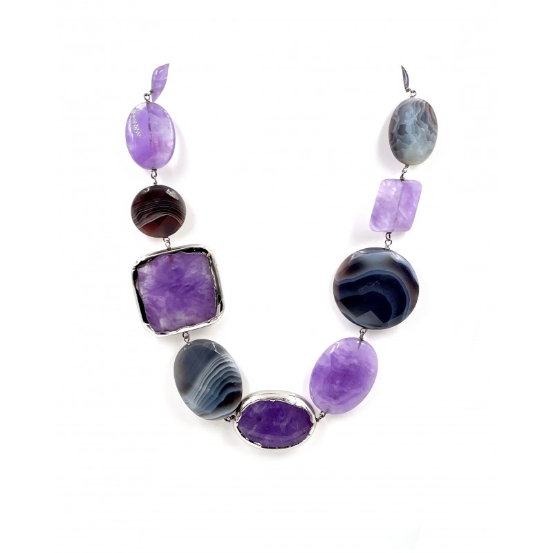 Composé de magnifiques pierres d'Améthyste et d'Agate, ce collier avec des pierres de différentes formes d'environ 4 cm facettées et lisses, certaines pierres revêtues de rhodium avec de l'argent 925, vous emmène dans un voyage à travers la splendeur des perles violettes.