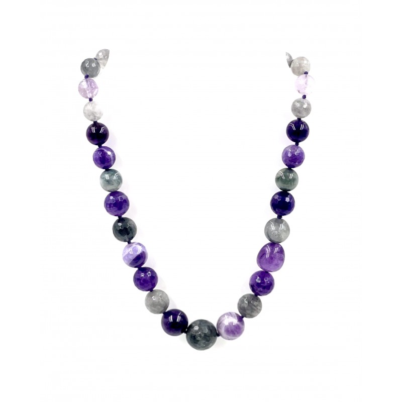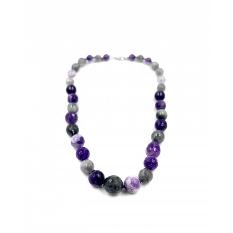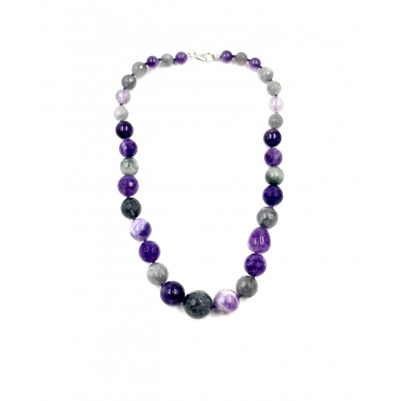 Composé de magnifiques pierres d'Améthyste, Agate et Oeil de Chat, ce collier avec des perles différentes formes, un dégradé de 8mm à 12mm, perles facettées et lisses.