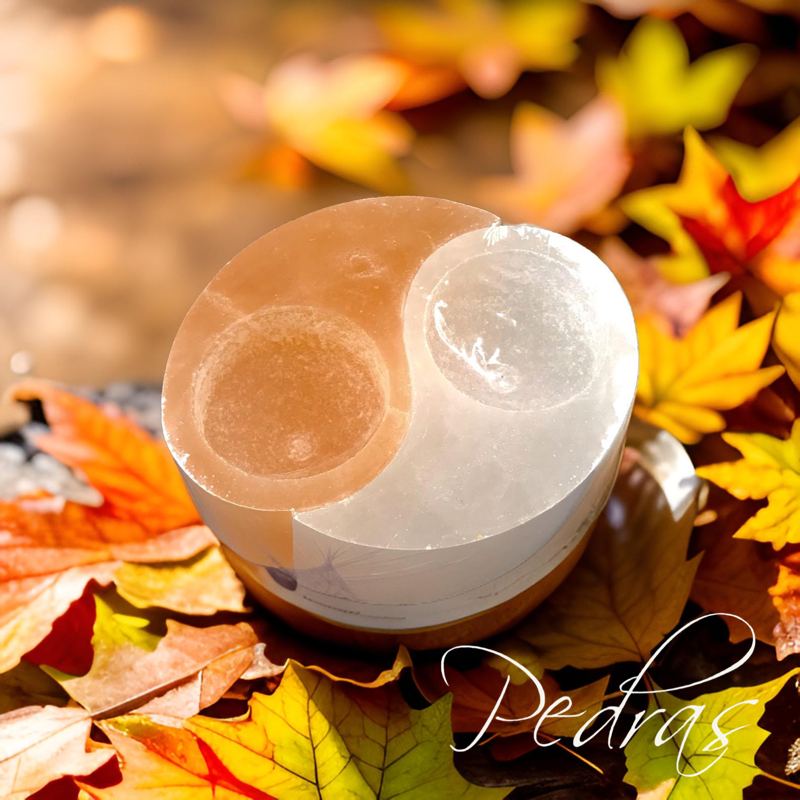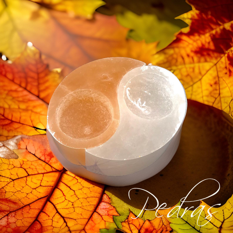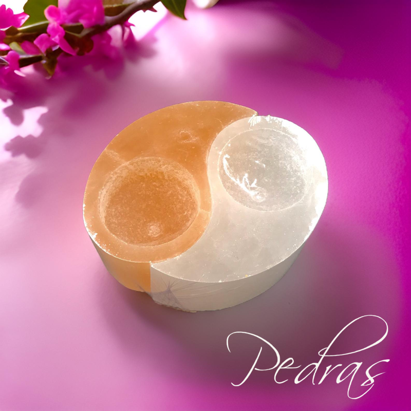 Bougeoir Sélénite forme infinity, Sélénite blanche e Sélénite orange.