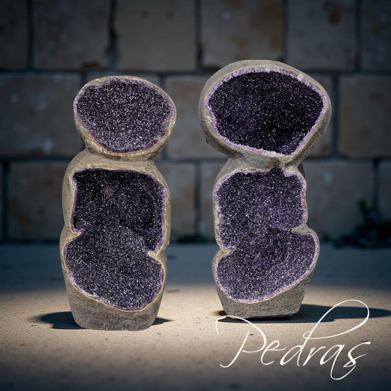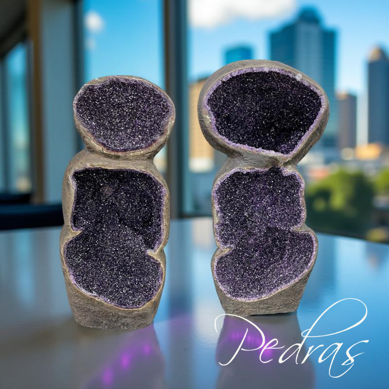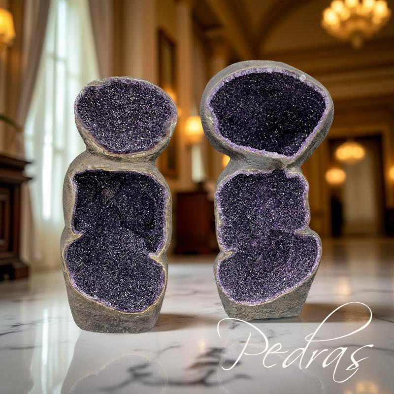 Ces deux géodes en améthyste sont des pièces uniques pour ajouter une touche spéciale à votre maison ou bureau. Avec une cristallisation incroyable, ces deux formes spéciales du même géode ne manqueront pas d'attirer l'attention et de surprendre dans n'importe quel environnement.