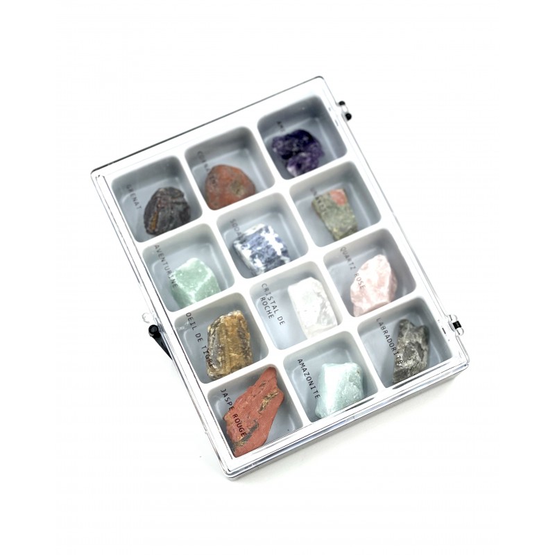 Une composition unique de 12 minéraux bruts dans une boite en plastique avec le nom des pierres sérigraphié sur le couvercle. Dimensions: 10x 12 cm