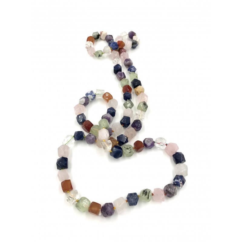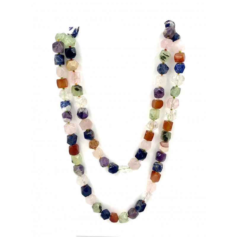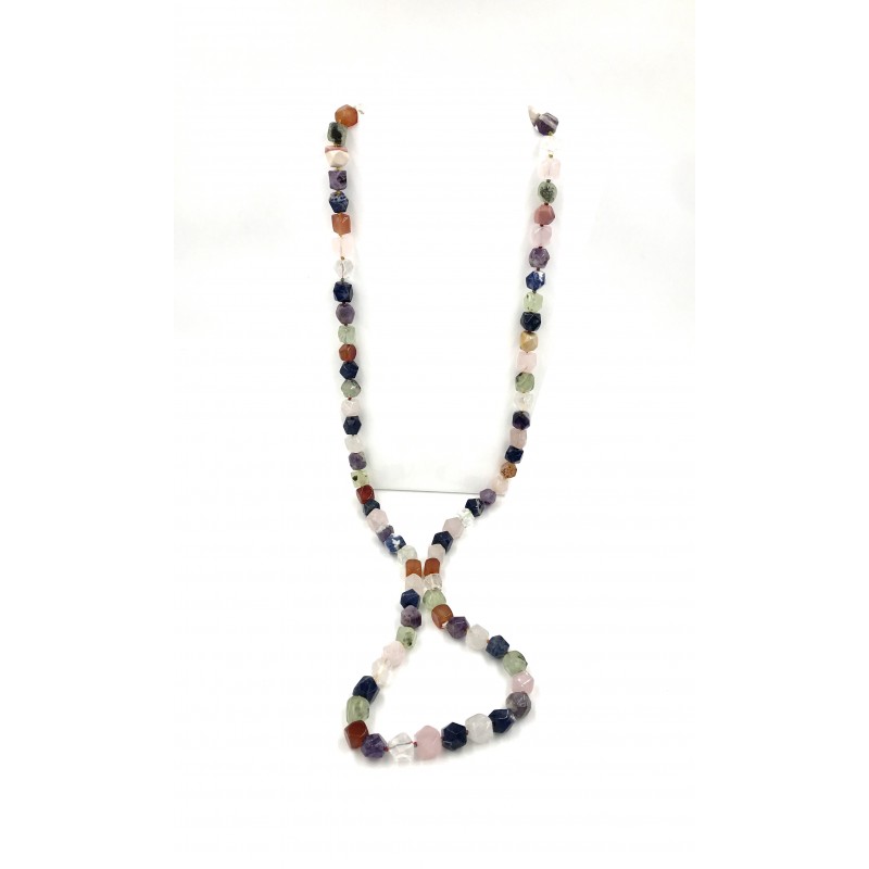 Composto por magníficas pedras misturadas, este colar de pedra de forma irregular de aproximadamente 14 mm leva você ao esplendor das contas de ametista, cornalina, quartzo rosa, cristal, sodalita, mokaïte, frenita. Este colar está disponível como um colar longo.