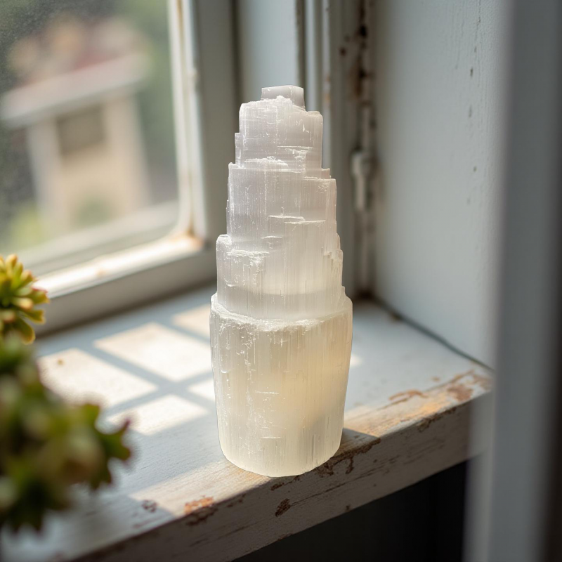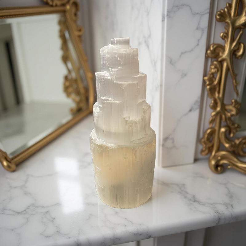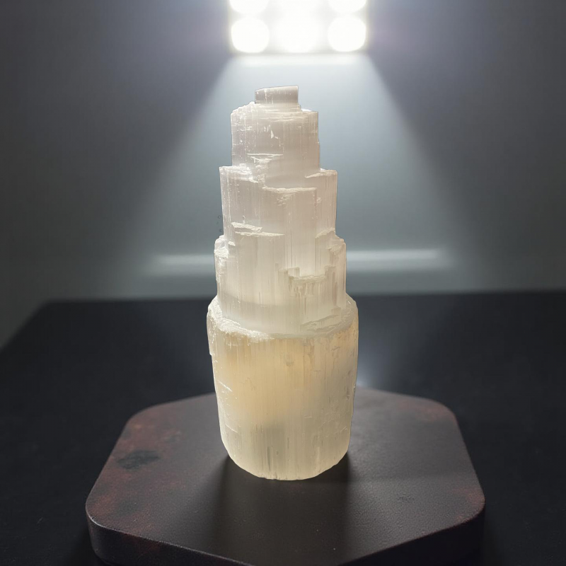 Em um nível mental.  A Selenita fornece clareza mental e ajuda você a permanecer no curso. É uma pedra estabilizadora que mantém seus pensamentos focados em sua intenção. Com esta pedra em mãos, permita que sua natureza intuitiva se funda com sua inteligência, mesclando conhecimento com sabedoria espiritual.