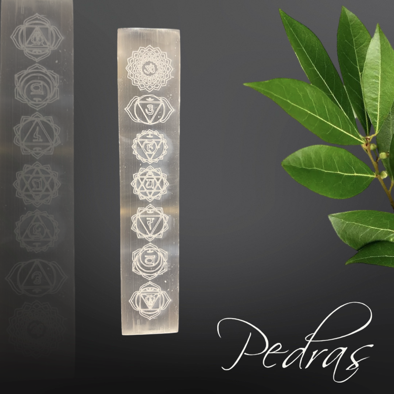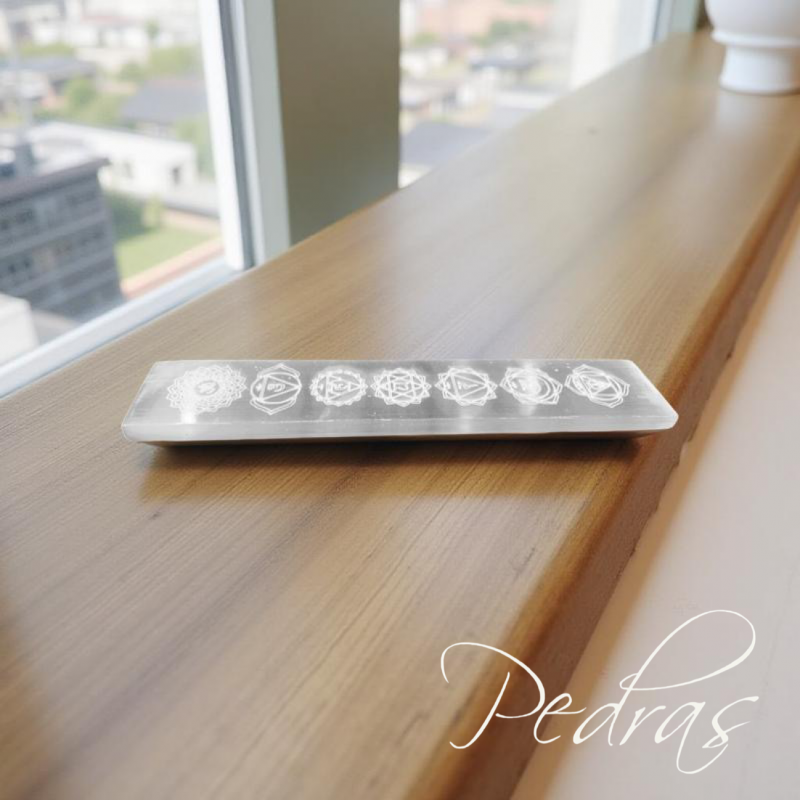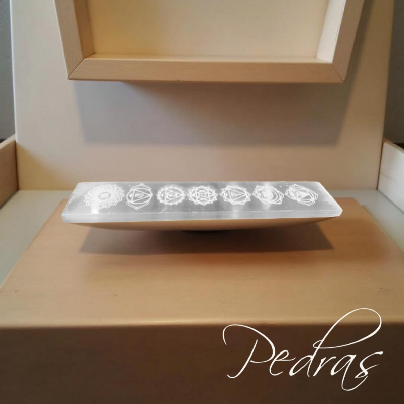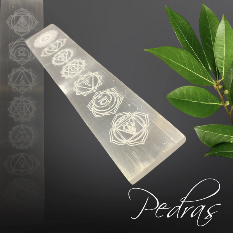 Bloco Selenita com desenho dos 7 chakras composto por 7 pedras naturais