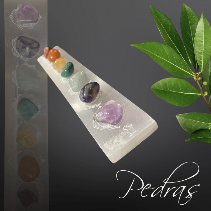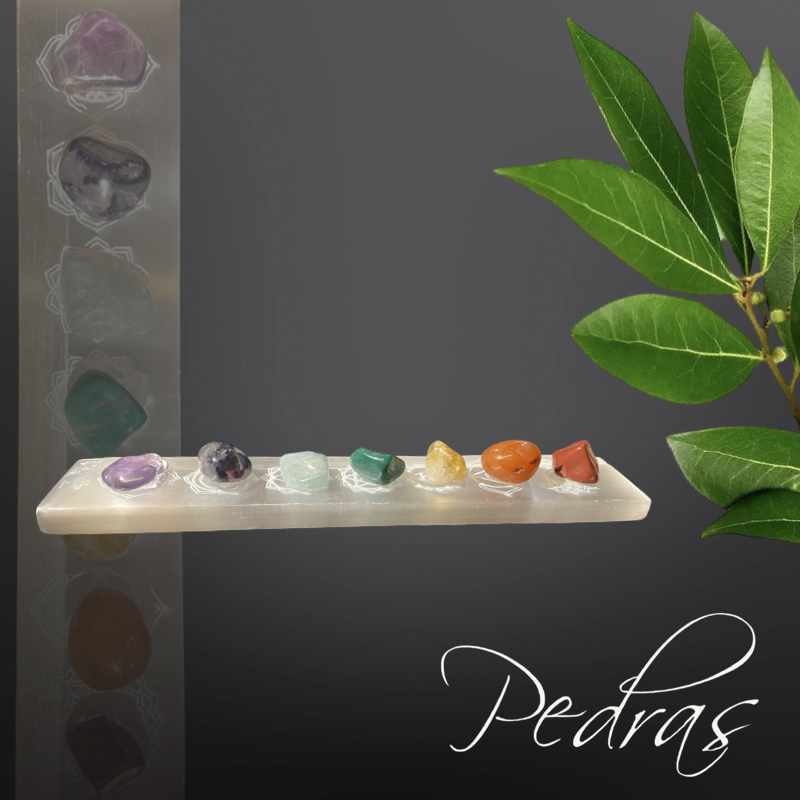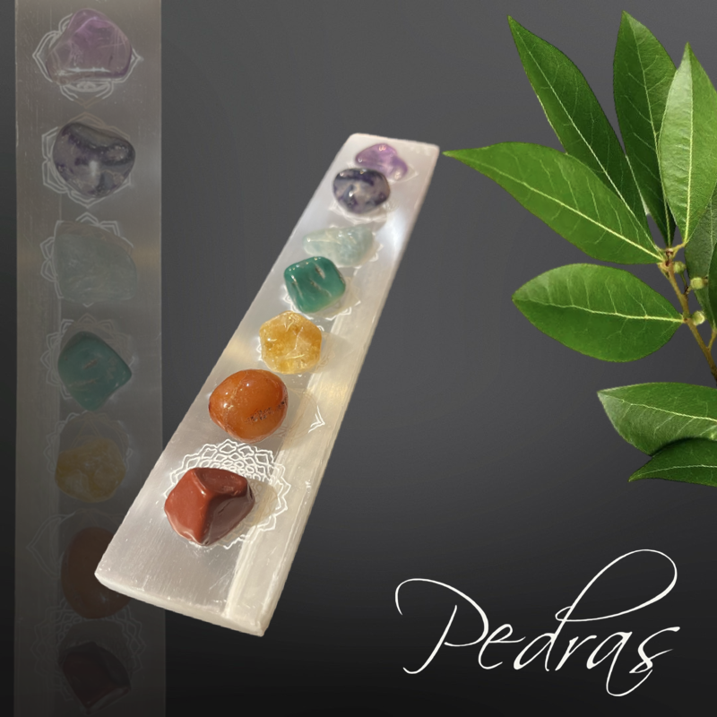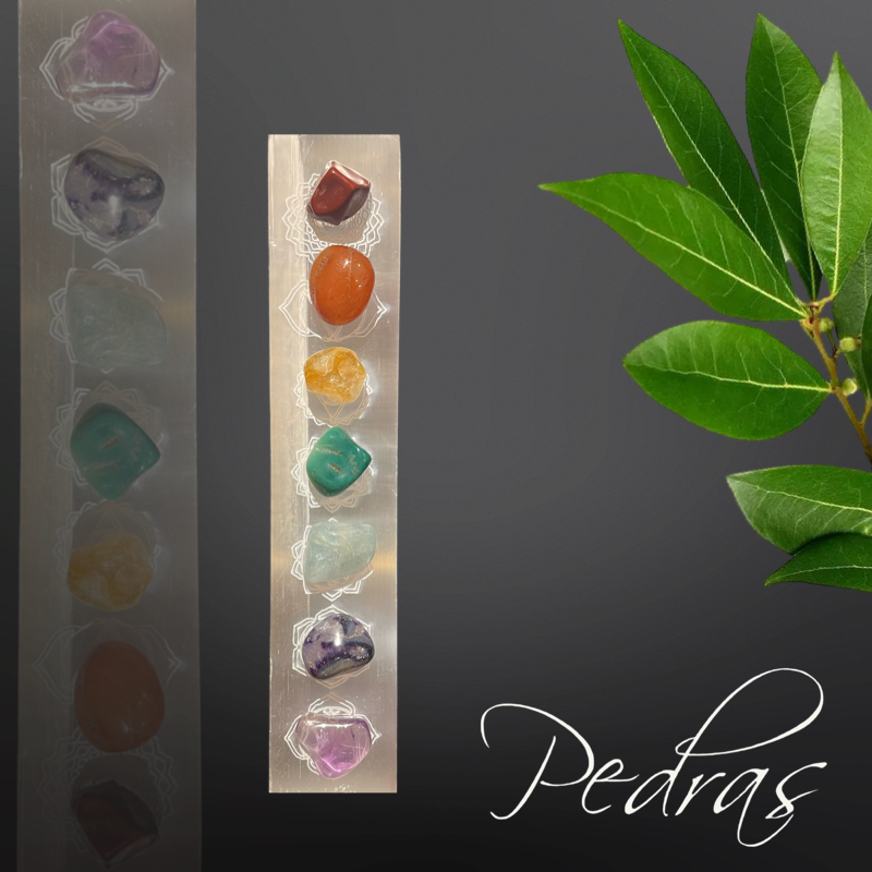 Bloco Selenita com desenho dos 7 chakras composto por 7 pedras naturais