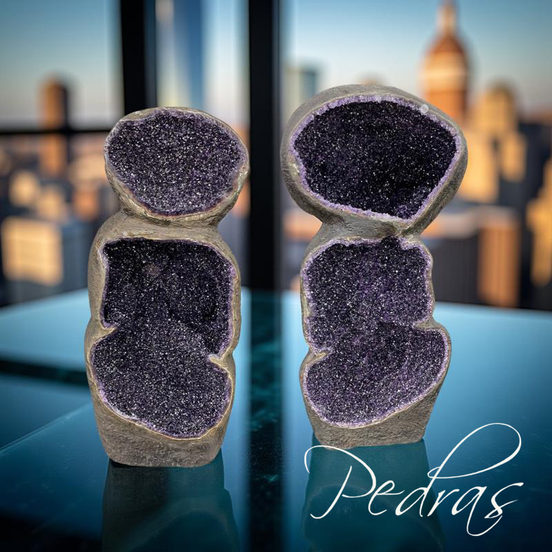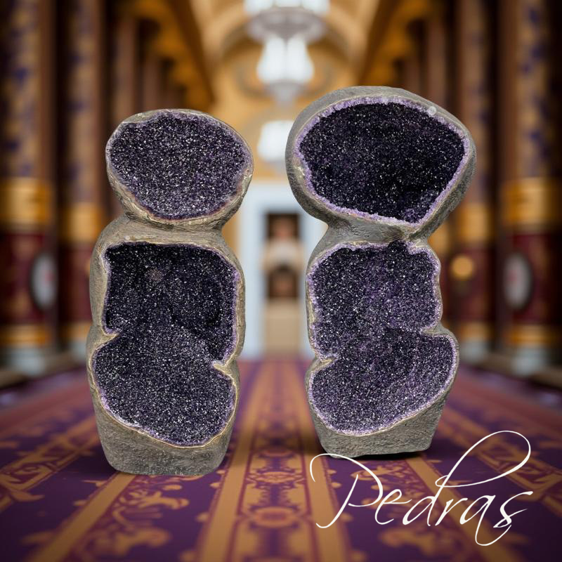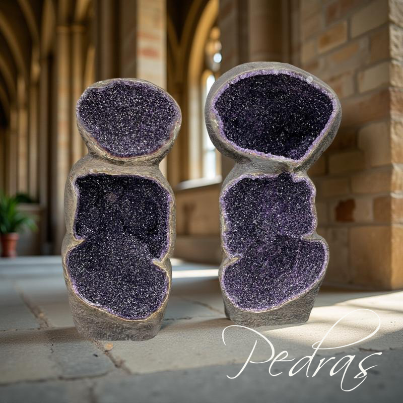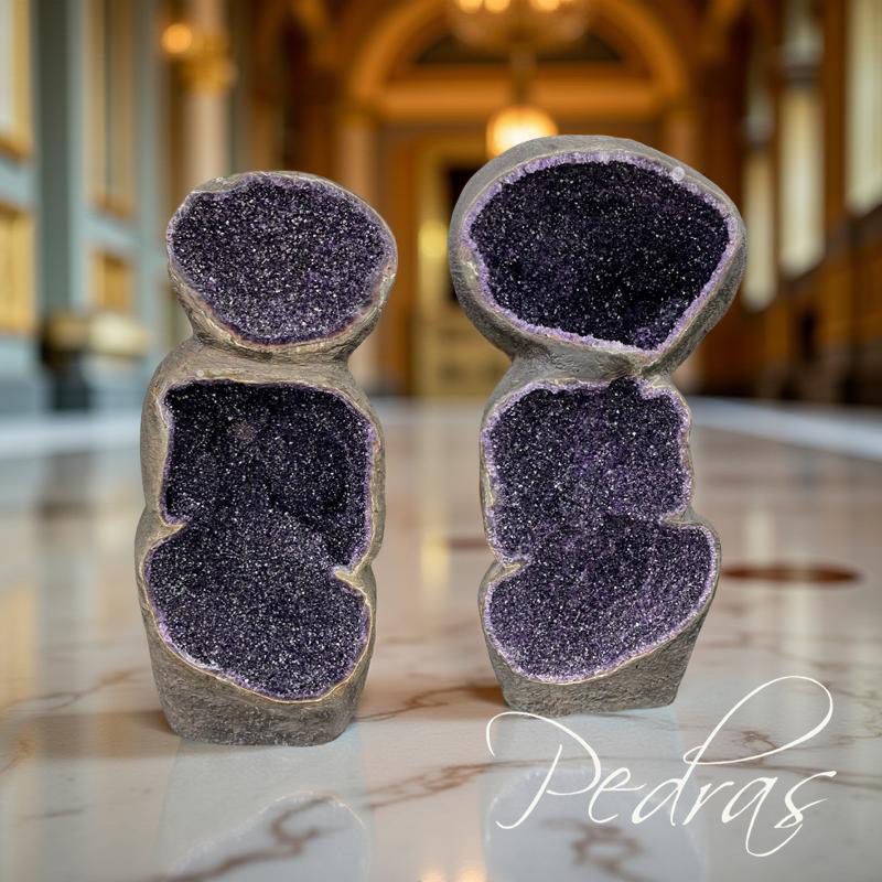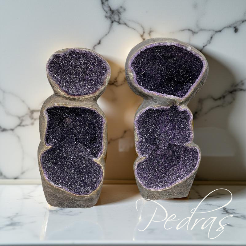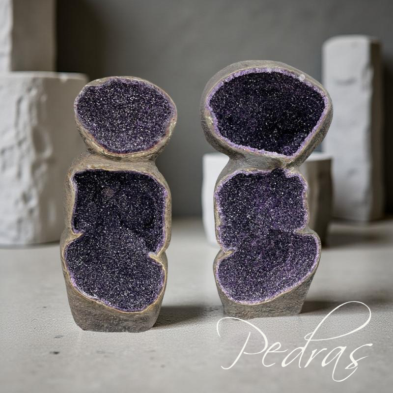 Estas dois Geodos de ametista são peças únicas para adicionar um toque especial à sua casa ou escritório. Com uma cristalização incrível, estas duas formas especiais do mesmo geodo certamente chamam a atenção e surpreendem em qualquer ambiente.