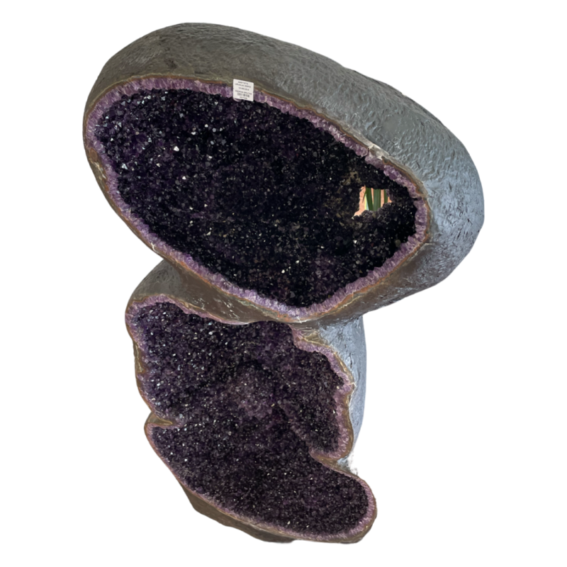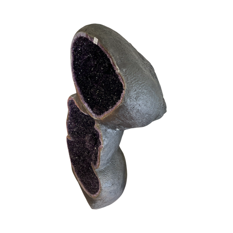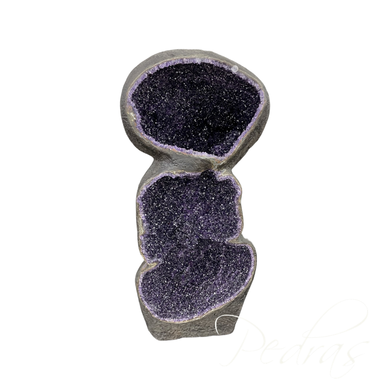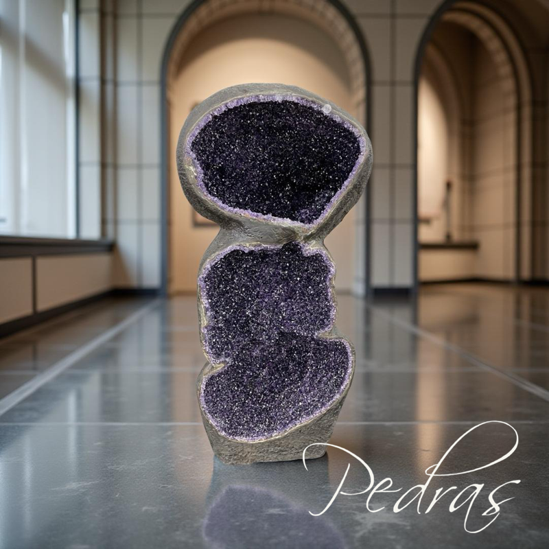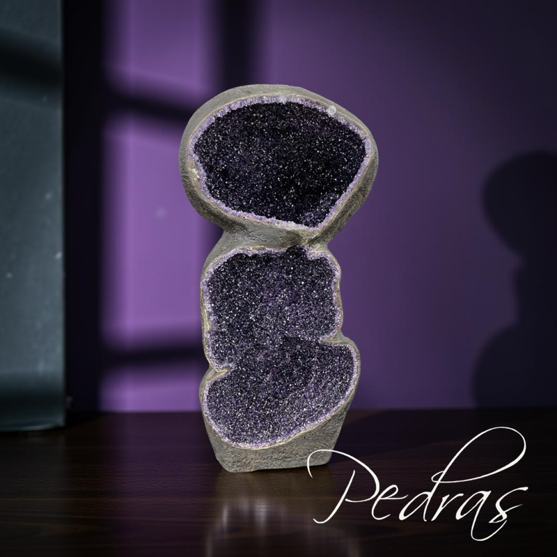 Uma elegante ametista para acrescentar beleza e cor à sua residência ou escritório. Seus padrões de cristal são ímpares e sua forma única será um ponto de destaque em qualquer ambiente.