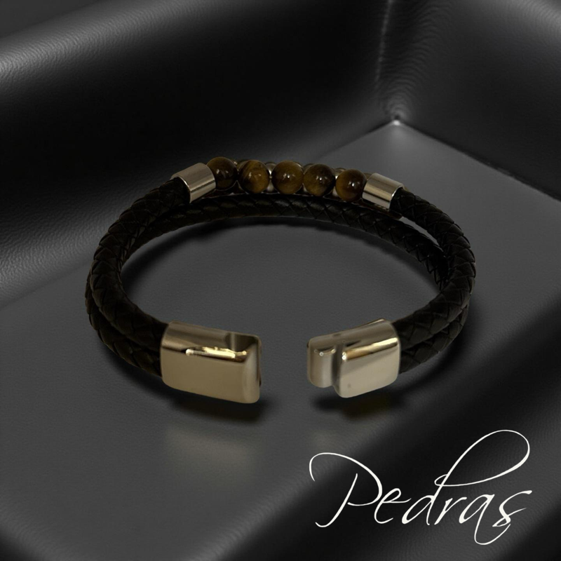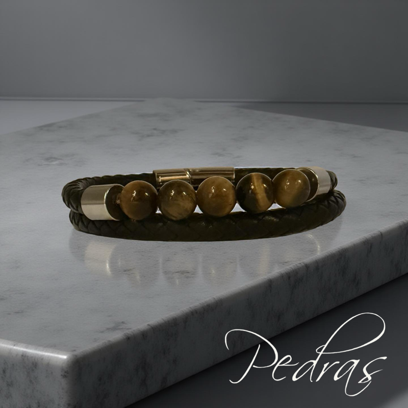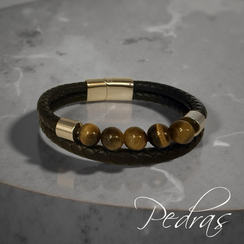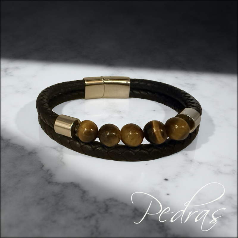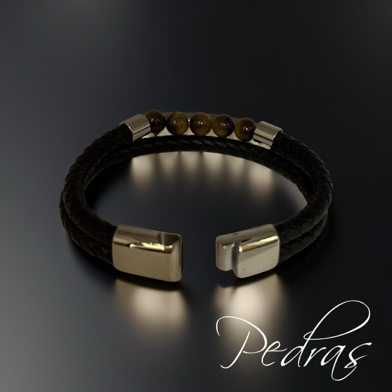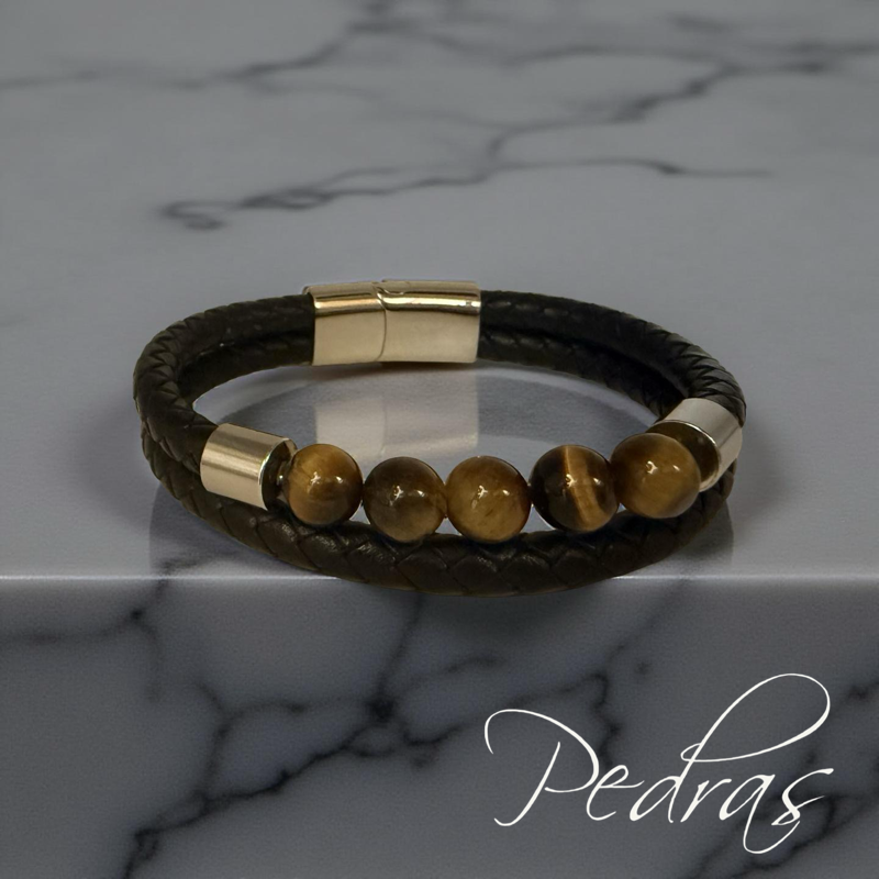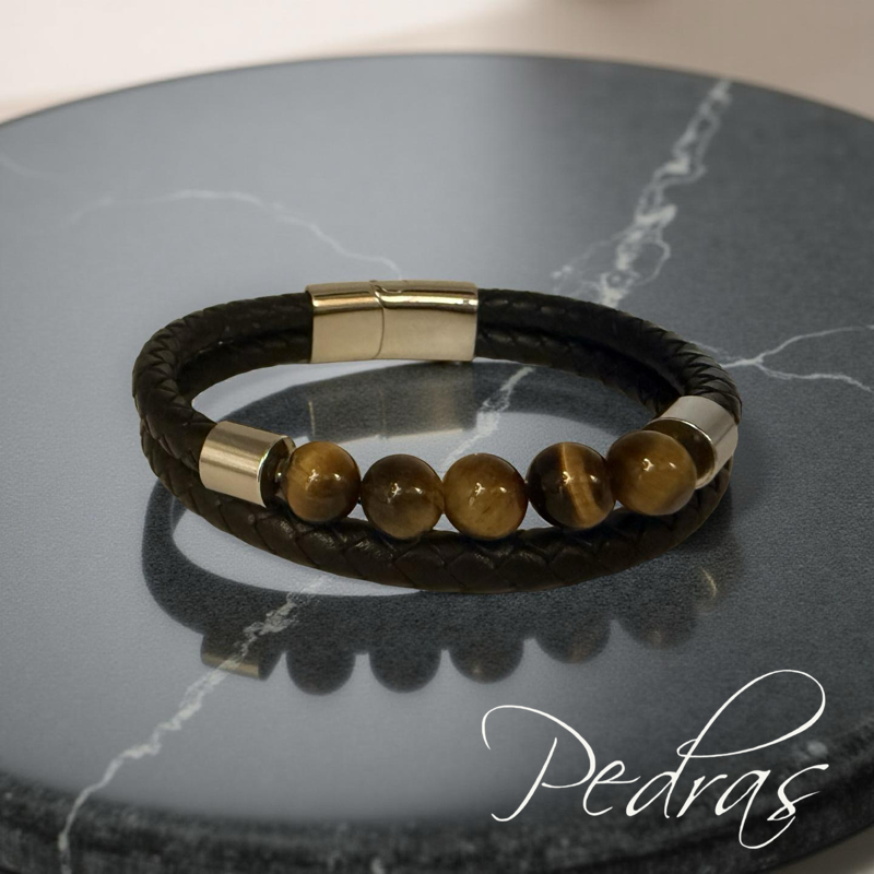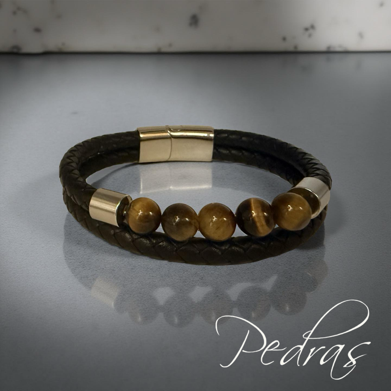 Pulseira Masculina 2 cordões de couro e 5 bolas em Olho de Tigre